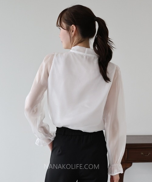 袖子採用柔軟透亮的歐根紗拼接,微微蓬袖讓比例更優雅,