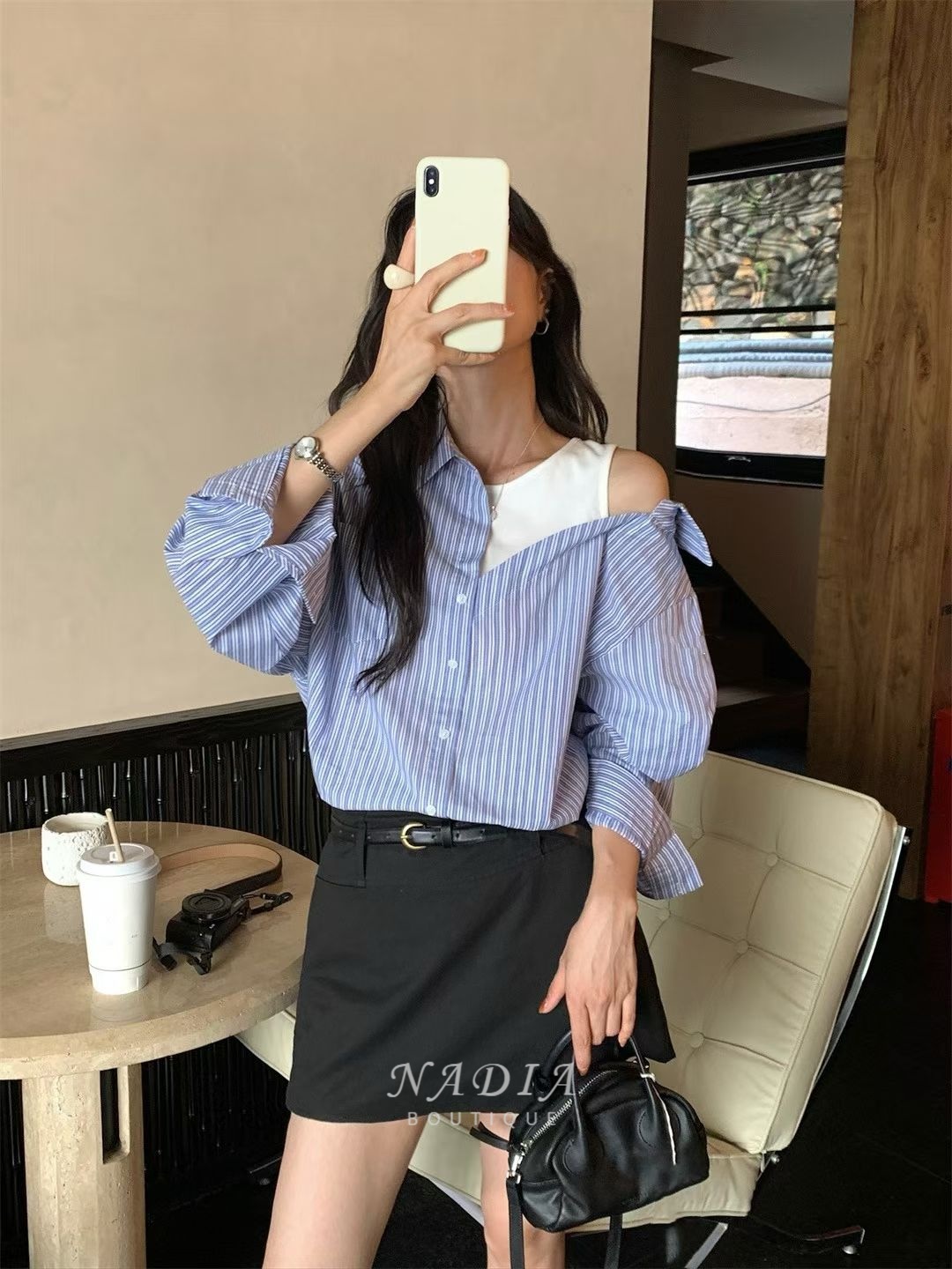 透過不對稱解構剪裁,打造若隱若現的肩線層次。