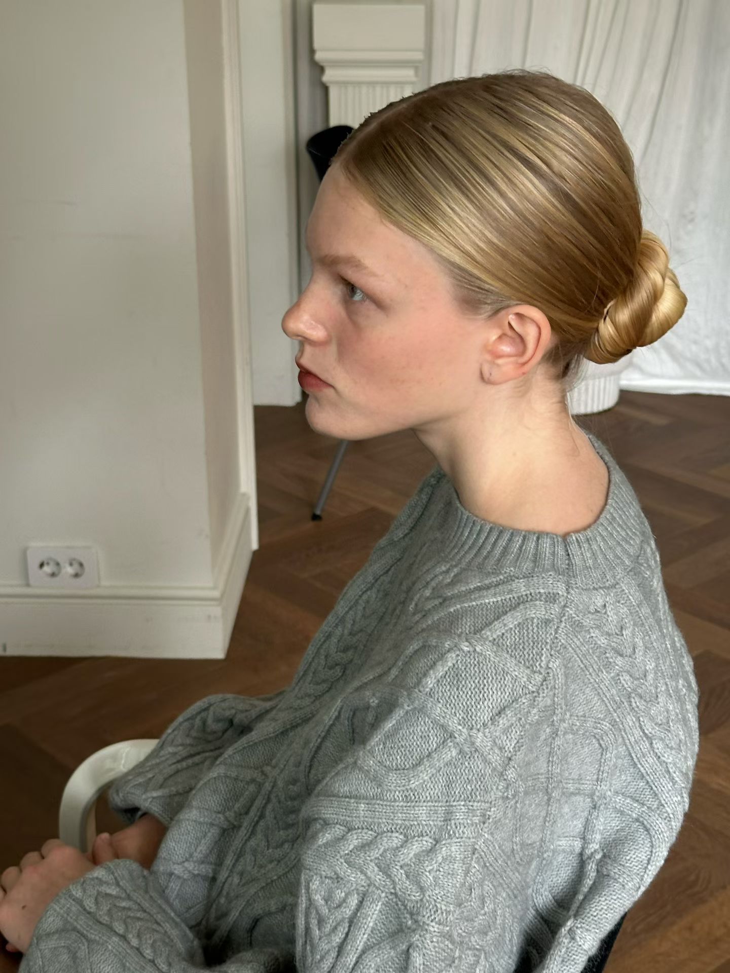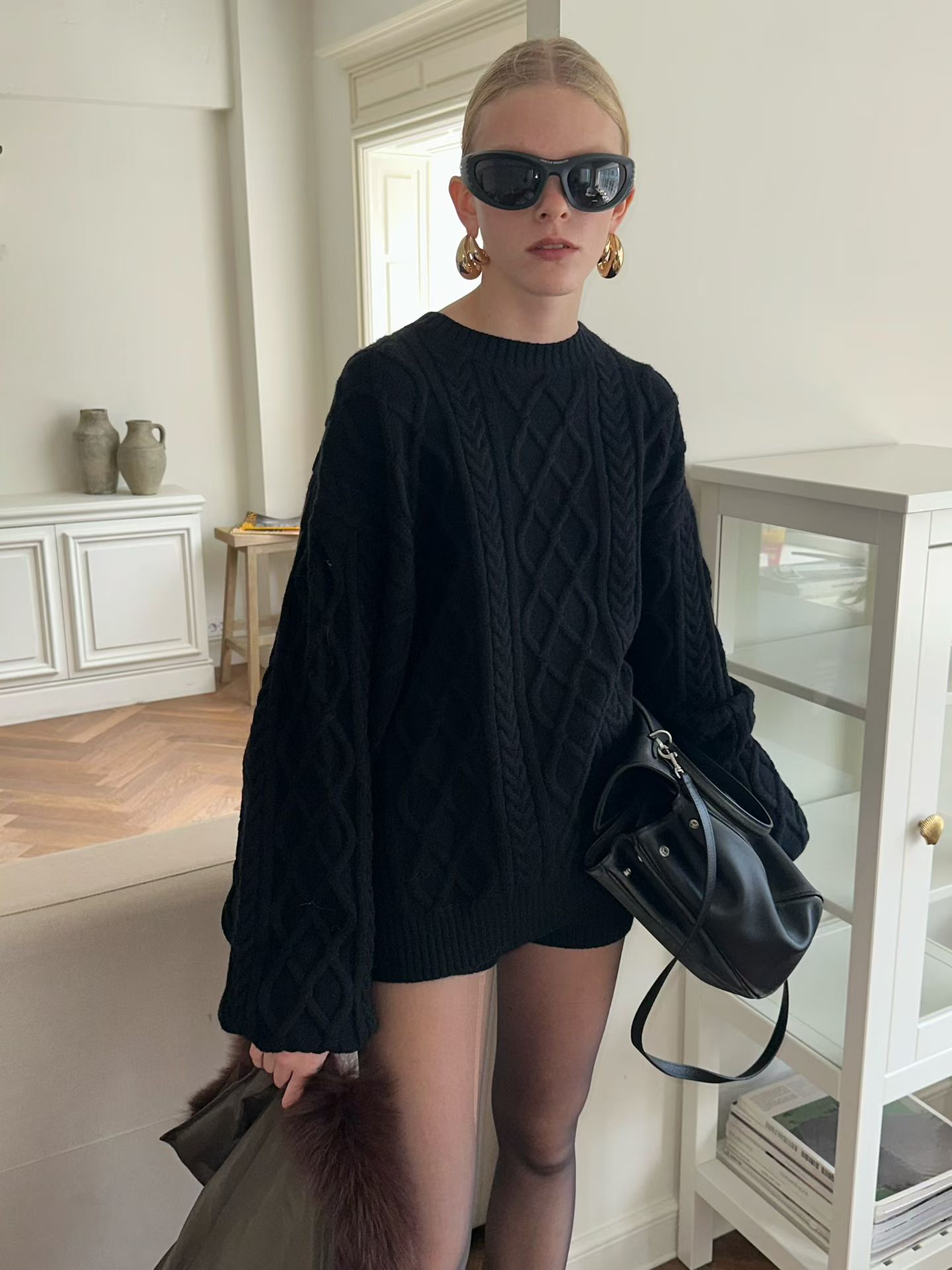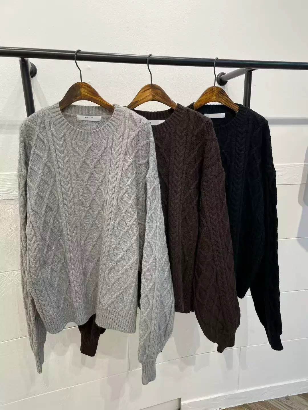 上衣是微鬆版圓領+立體麻花織紋設計,