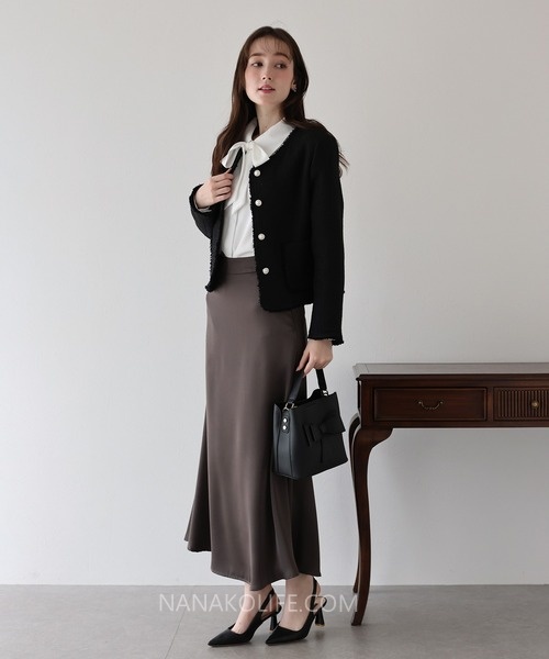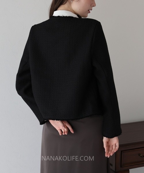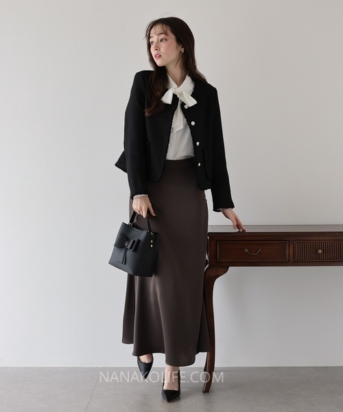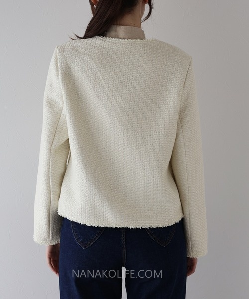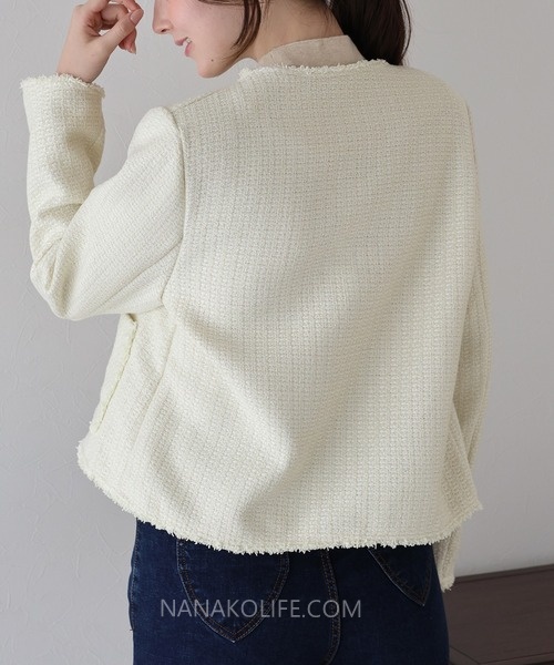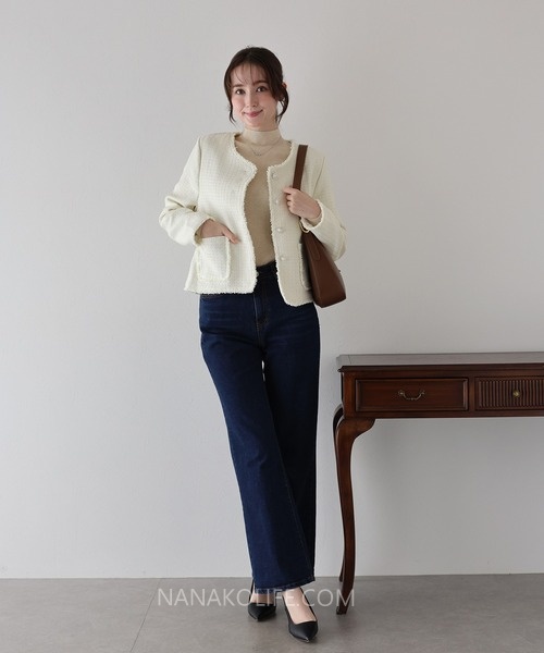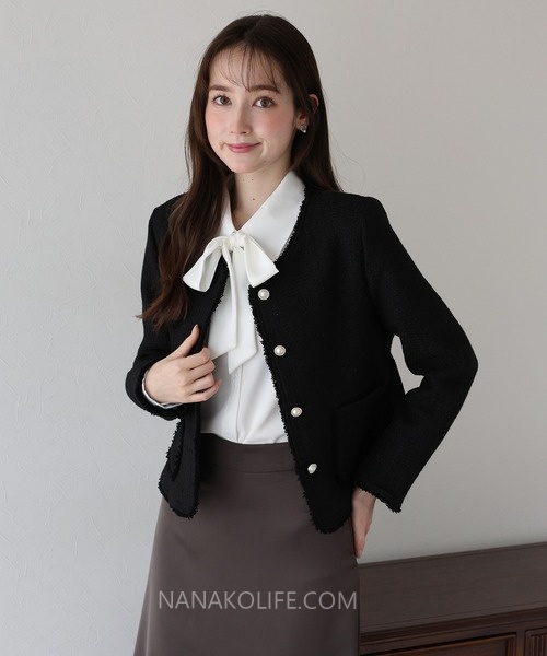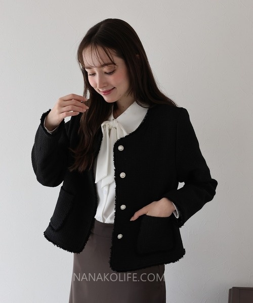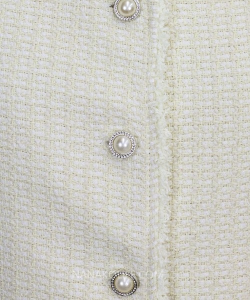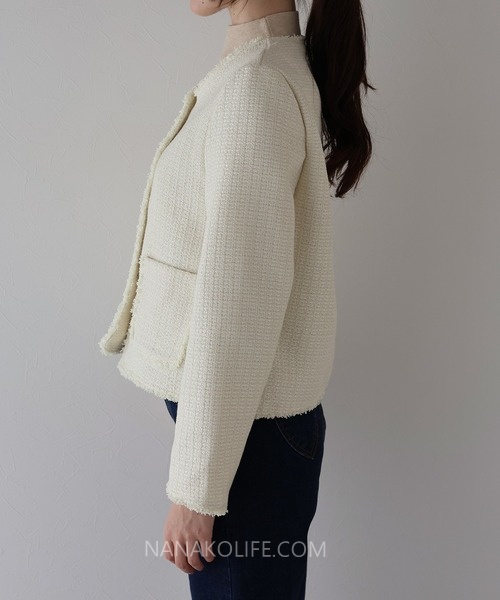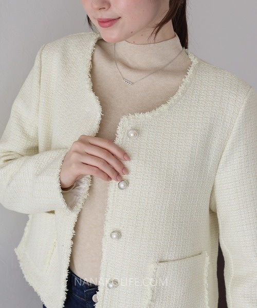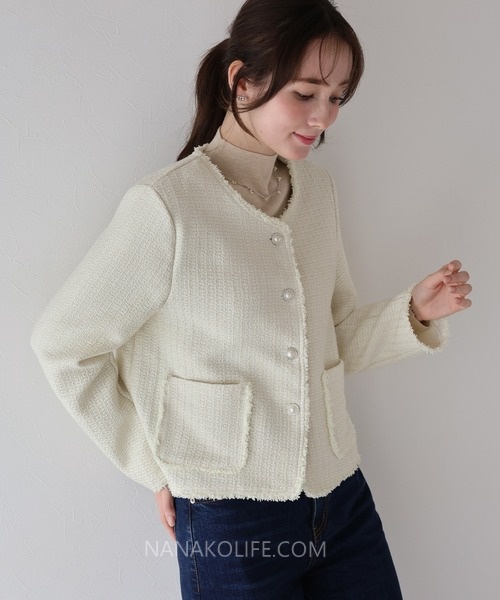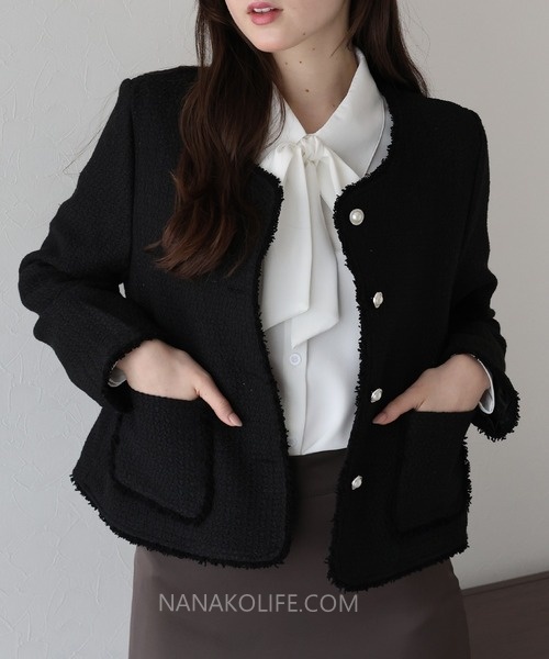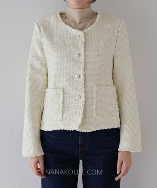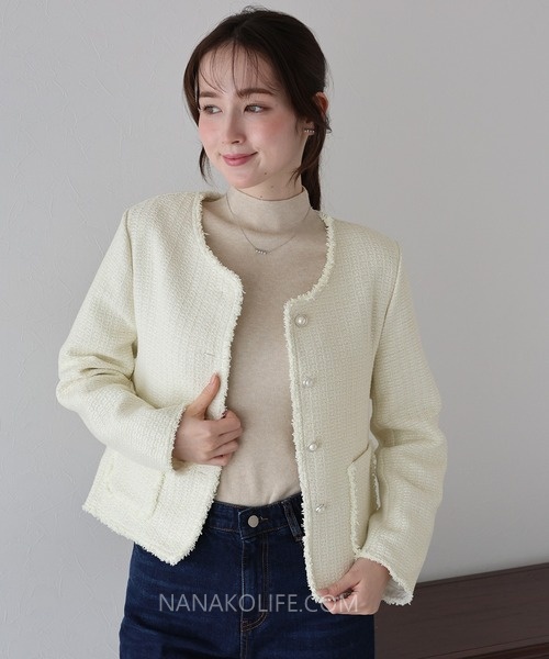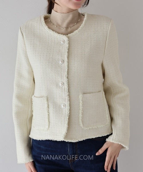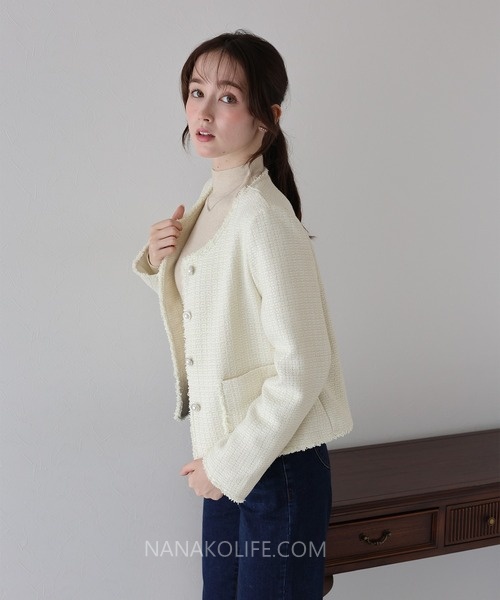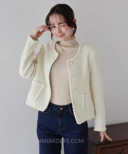 珍珠扣+毛邊滾線讓整體質感直接往上拉。