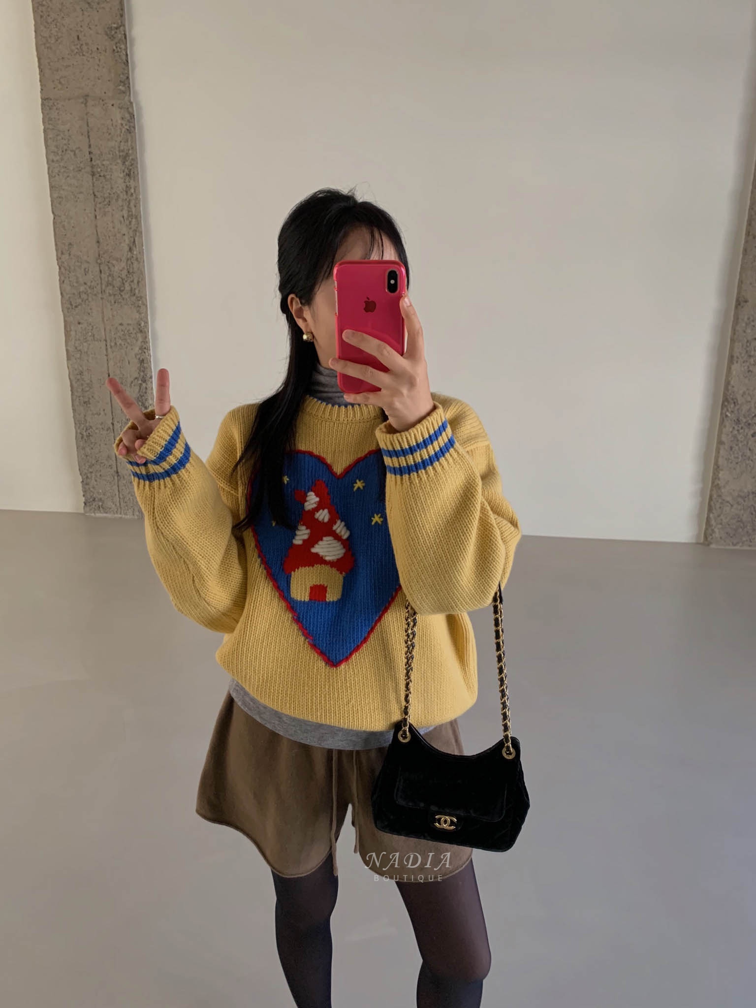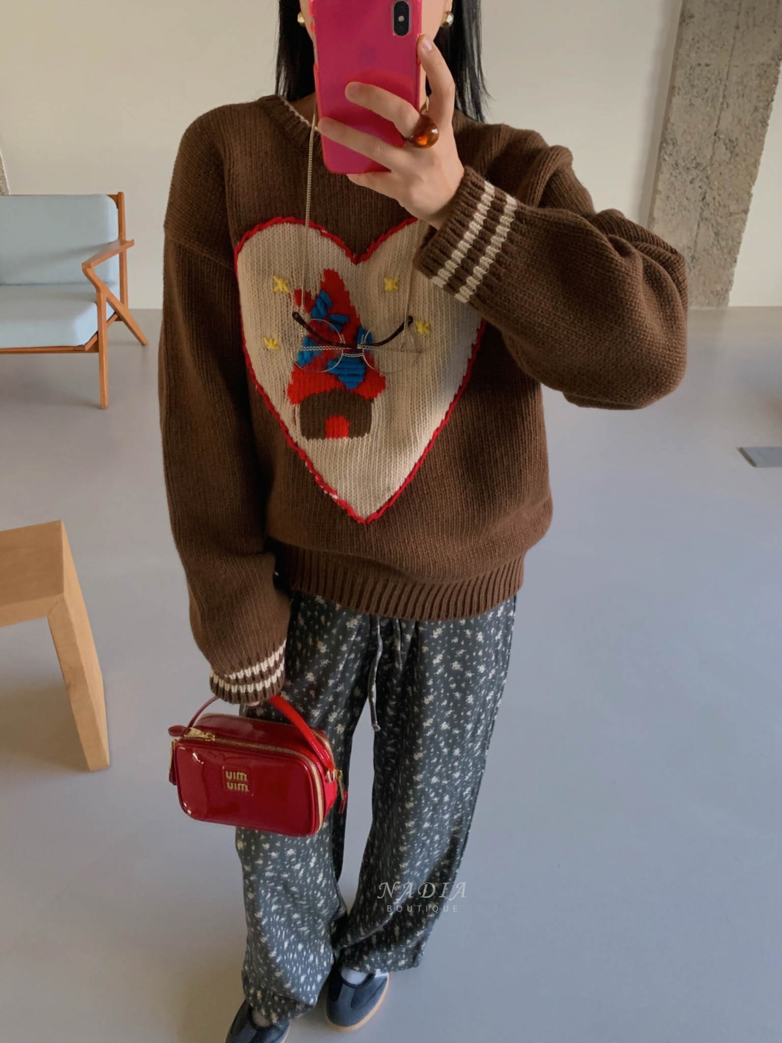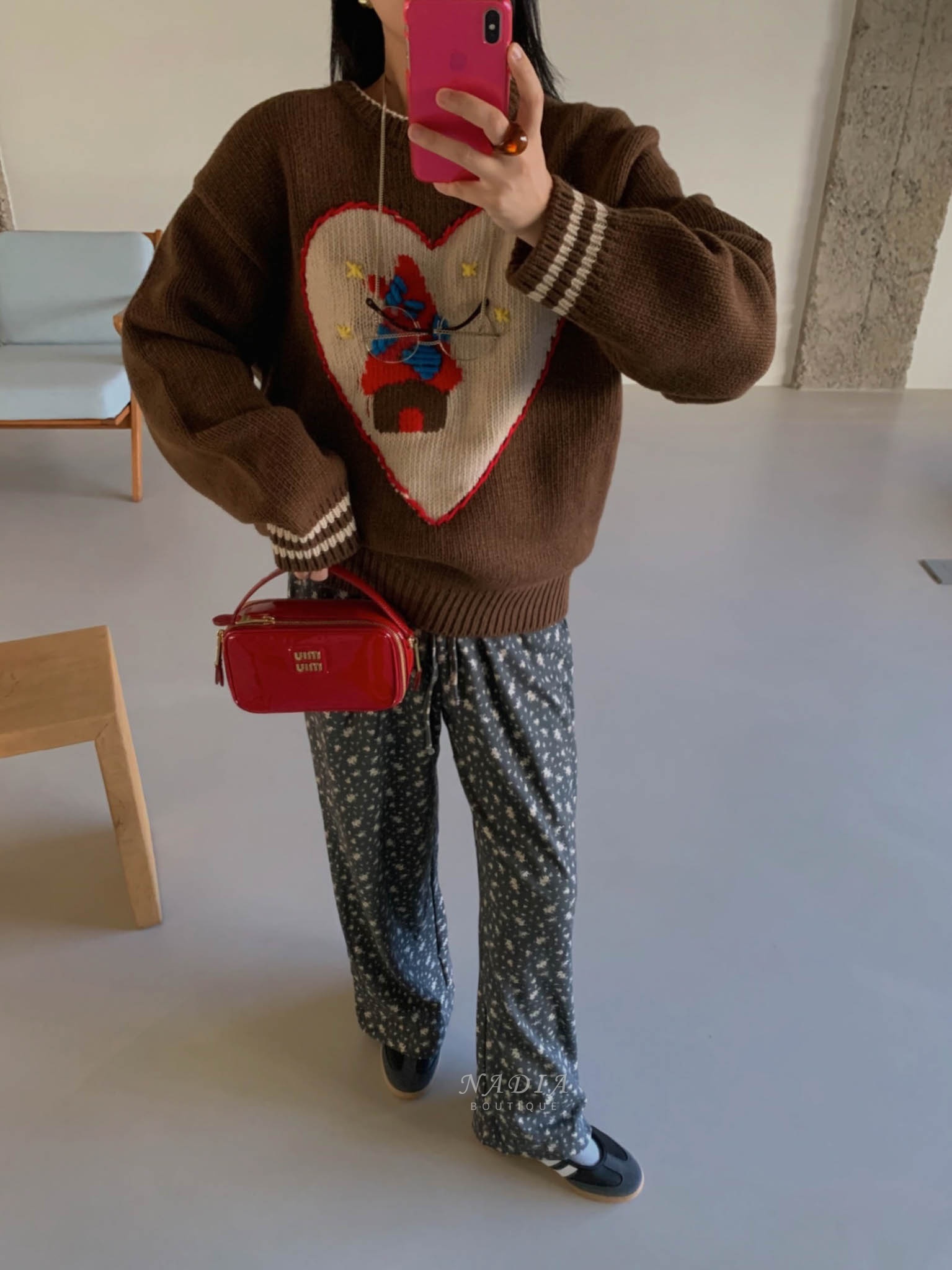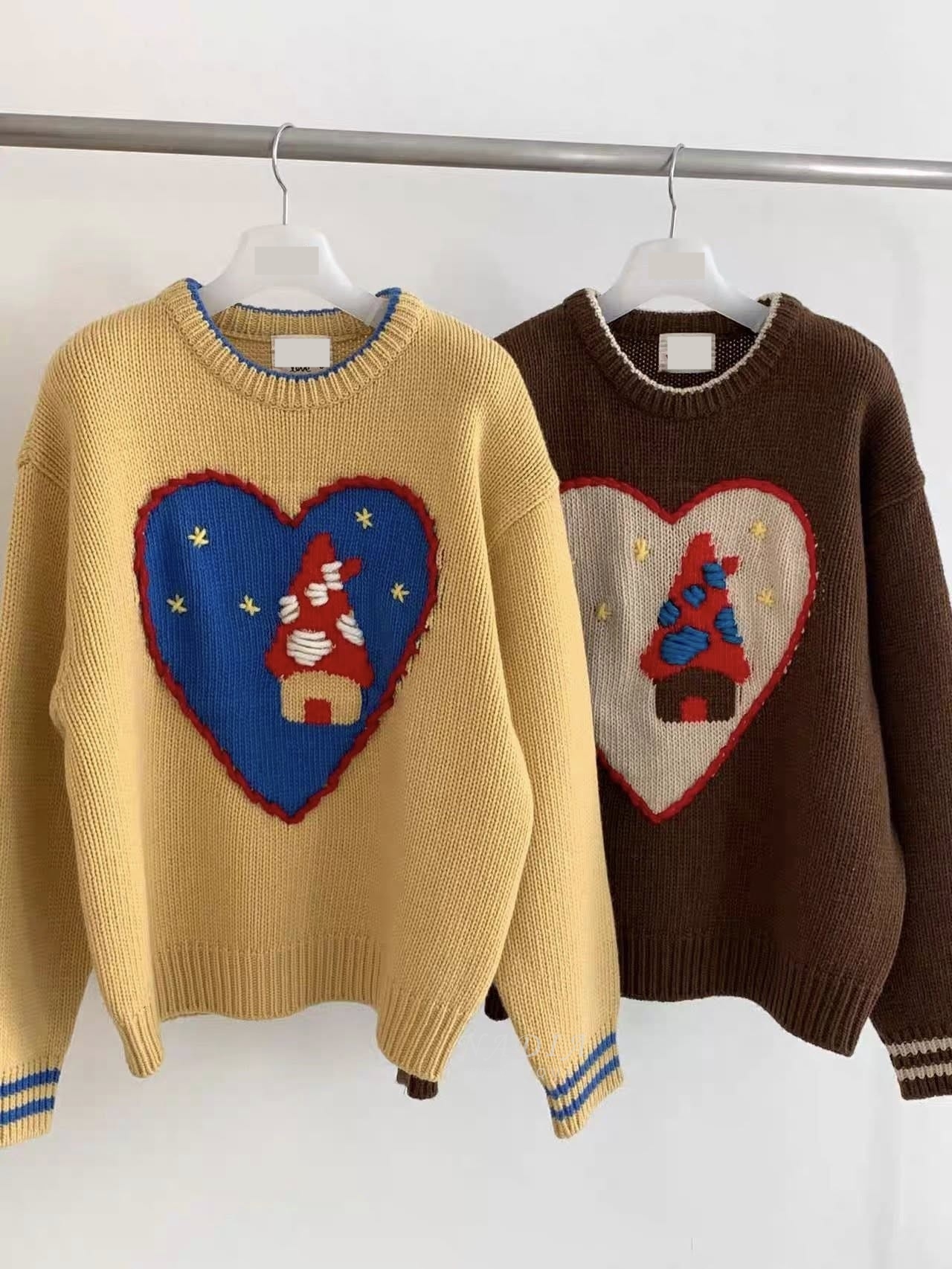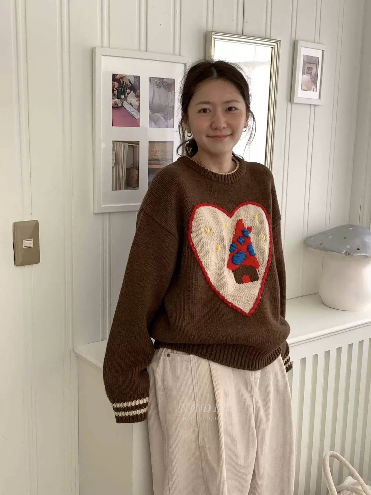 一件讓冬天變得柔軟可愛的毛衣。 胸前的愛心+聖誕小屋,以立體織紋呈現,細節滿滿又不幼稚。 版型偏寬鬆,單穿就很有存在感,也能搭落地褲、牛仔褲走氣質休閒風。 冬日節慶想拍照、約會、聚餐,這件穿上就是亮點。