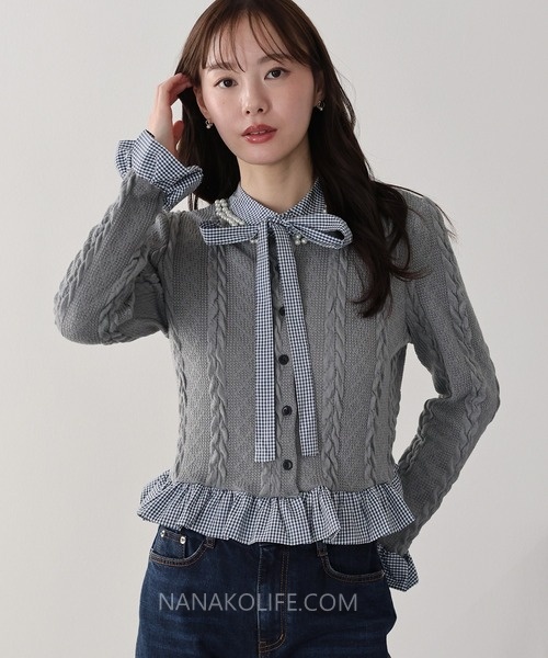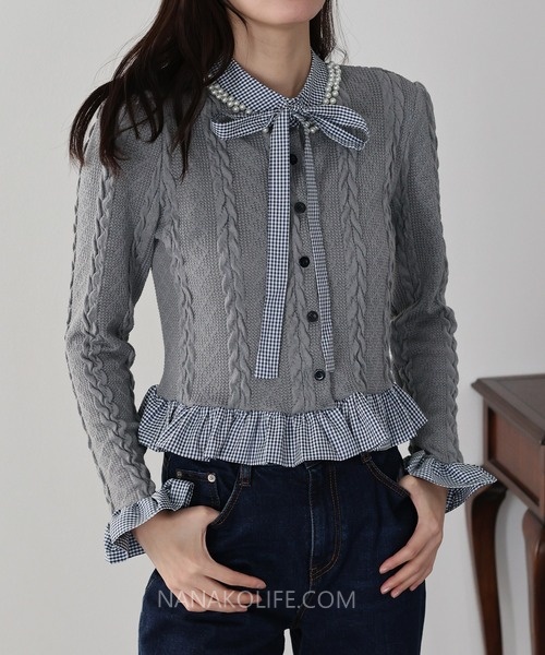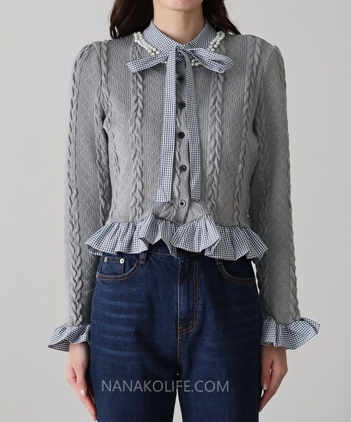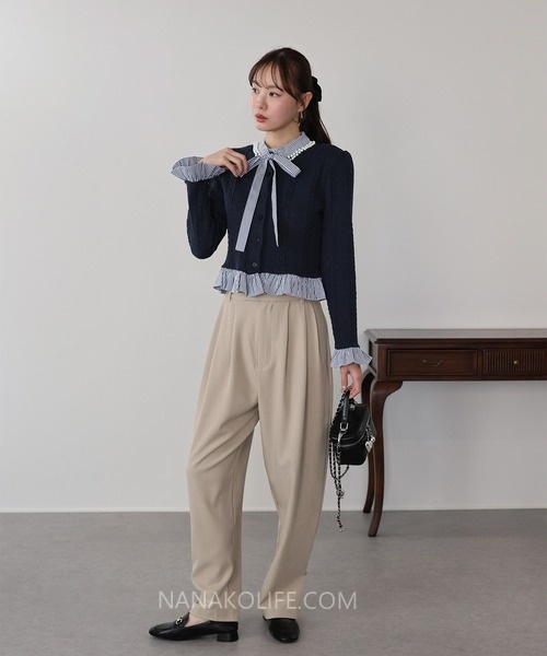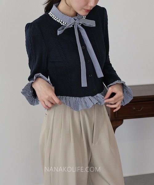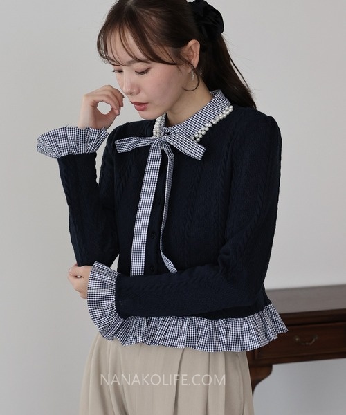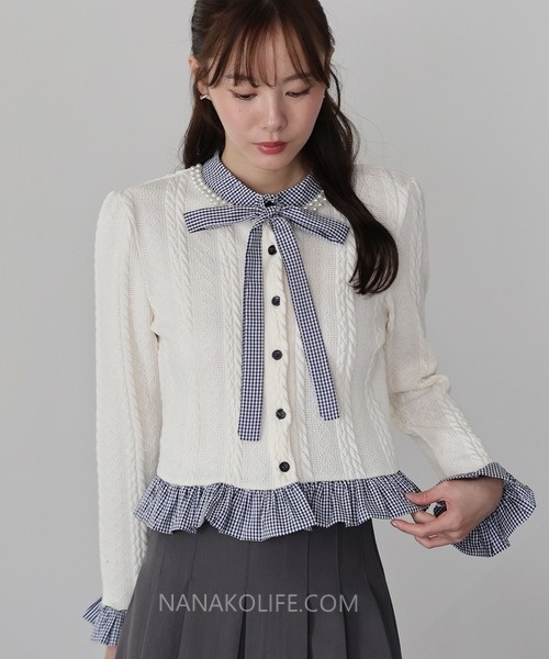 領口的珍珠裝飾+綁帶蝴蝶結,是那種近看更精緻的細節。