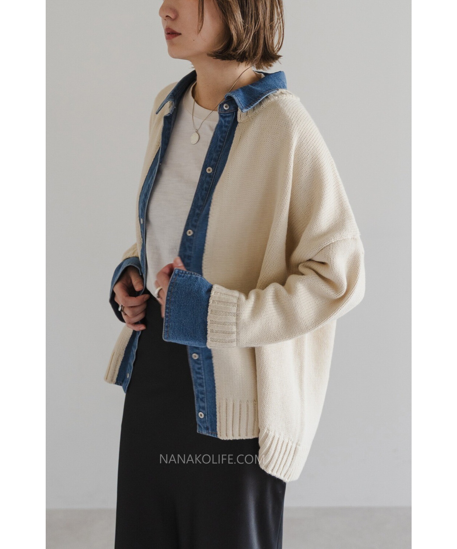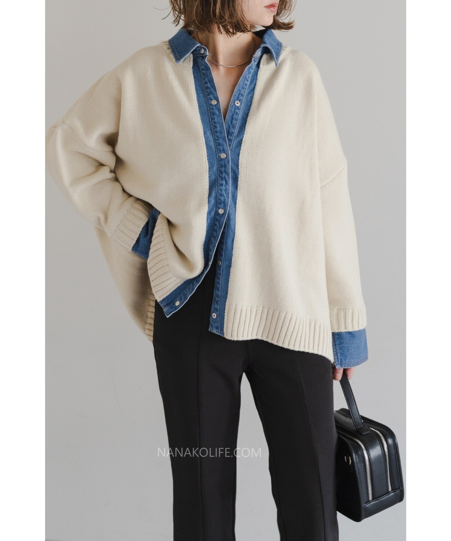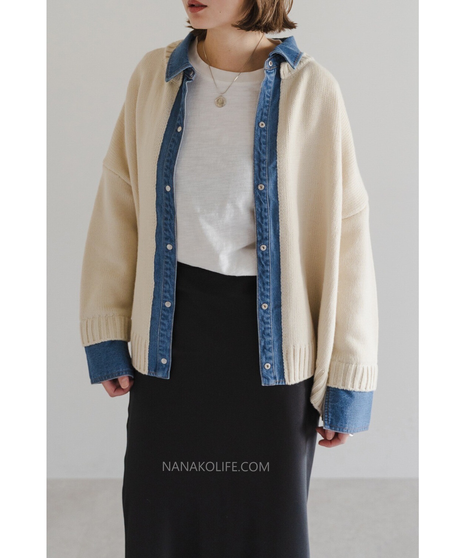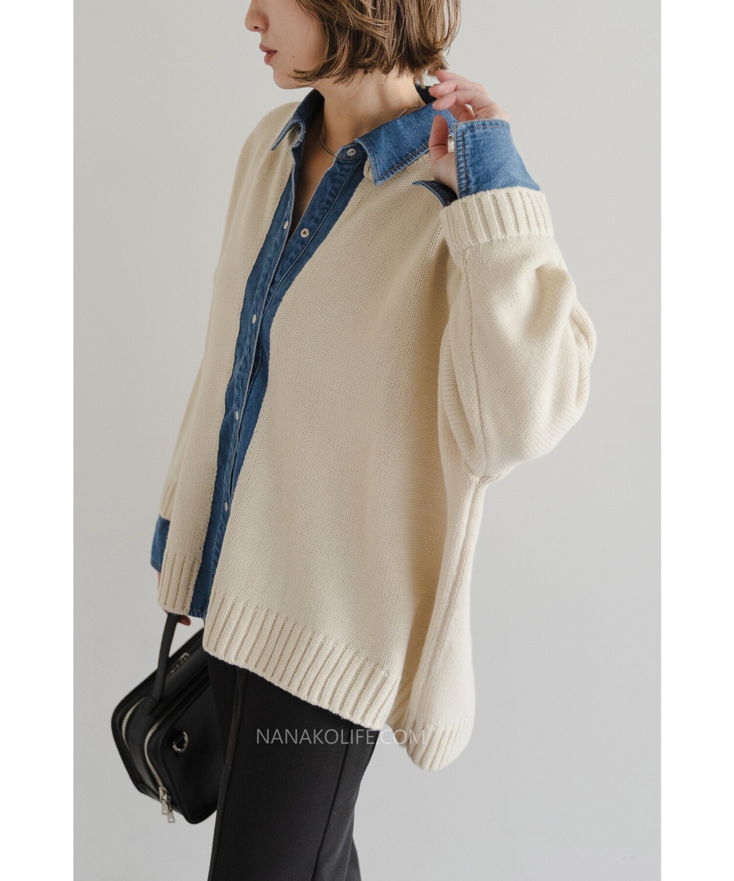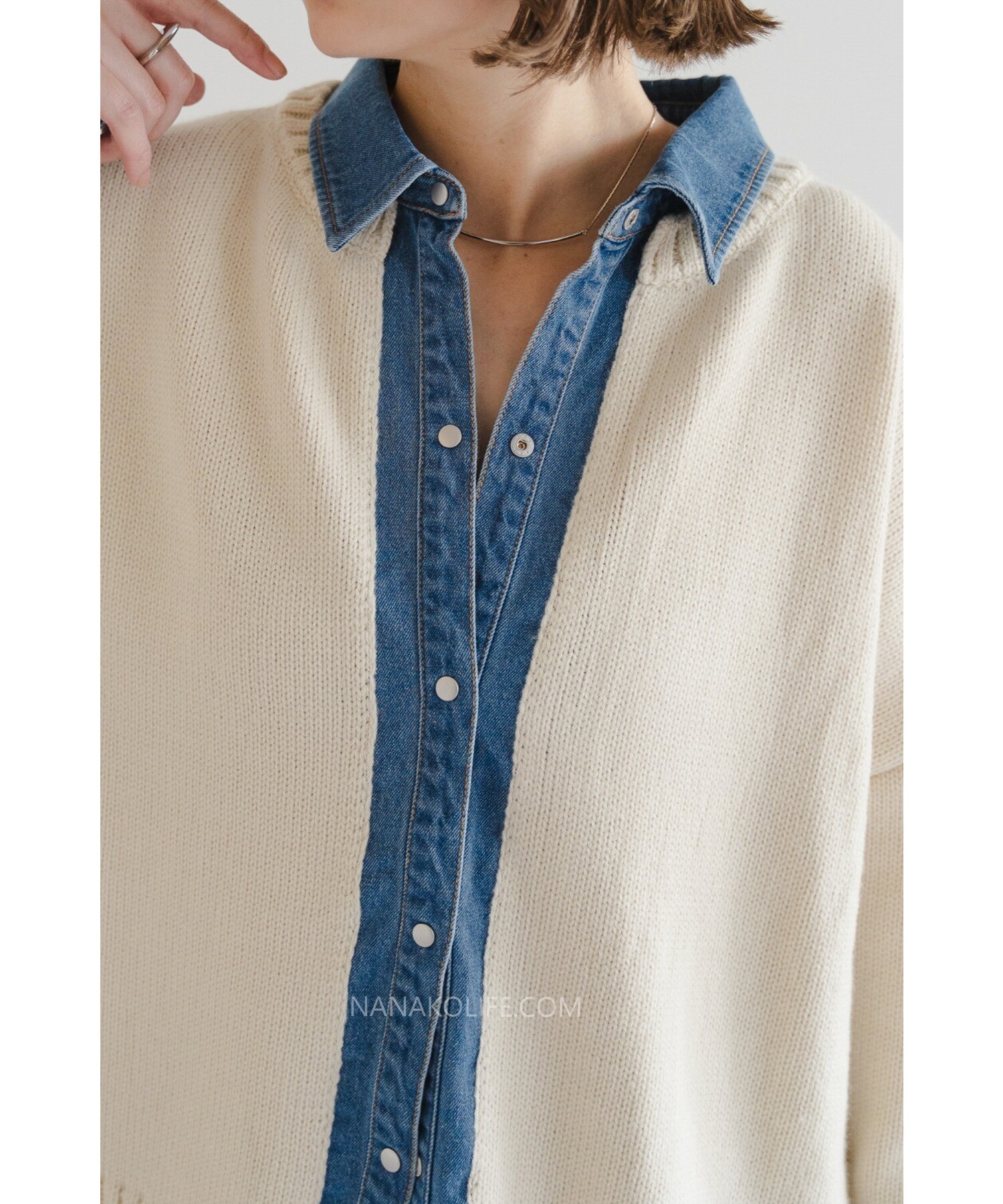 柔軟的米杏針織外層,把丹寧襯衫做成「假兩件」設計,