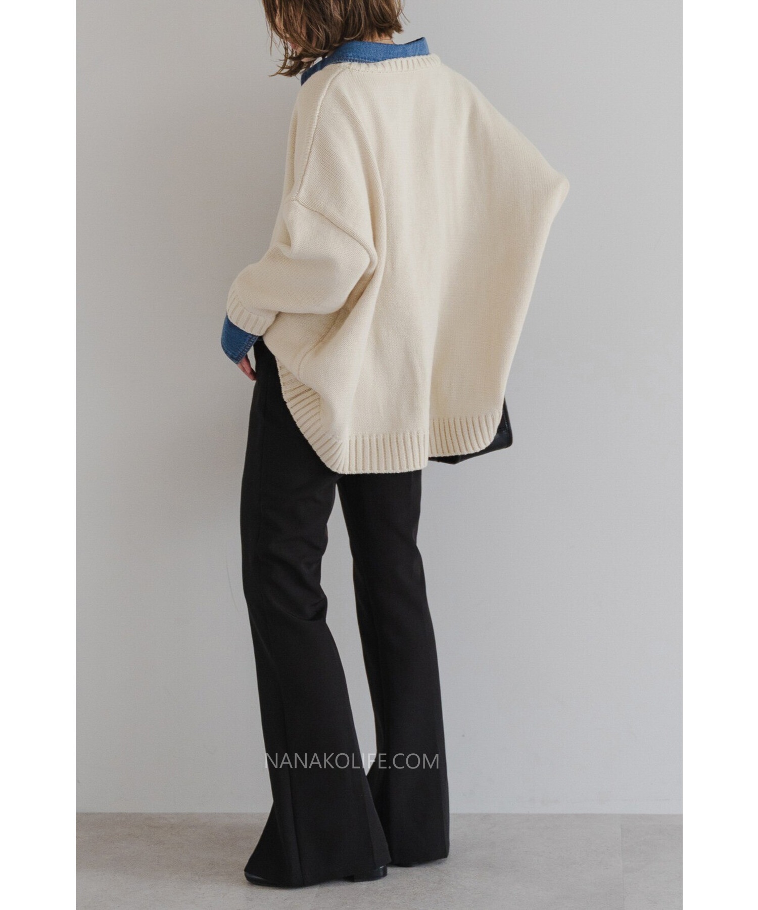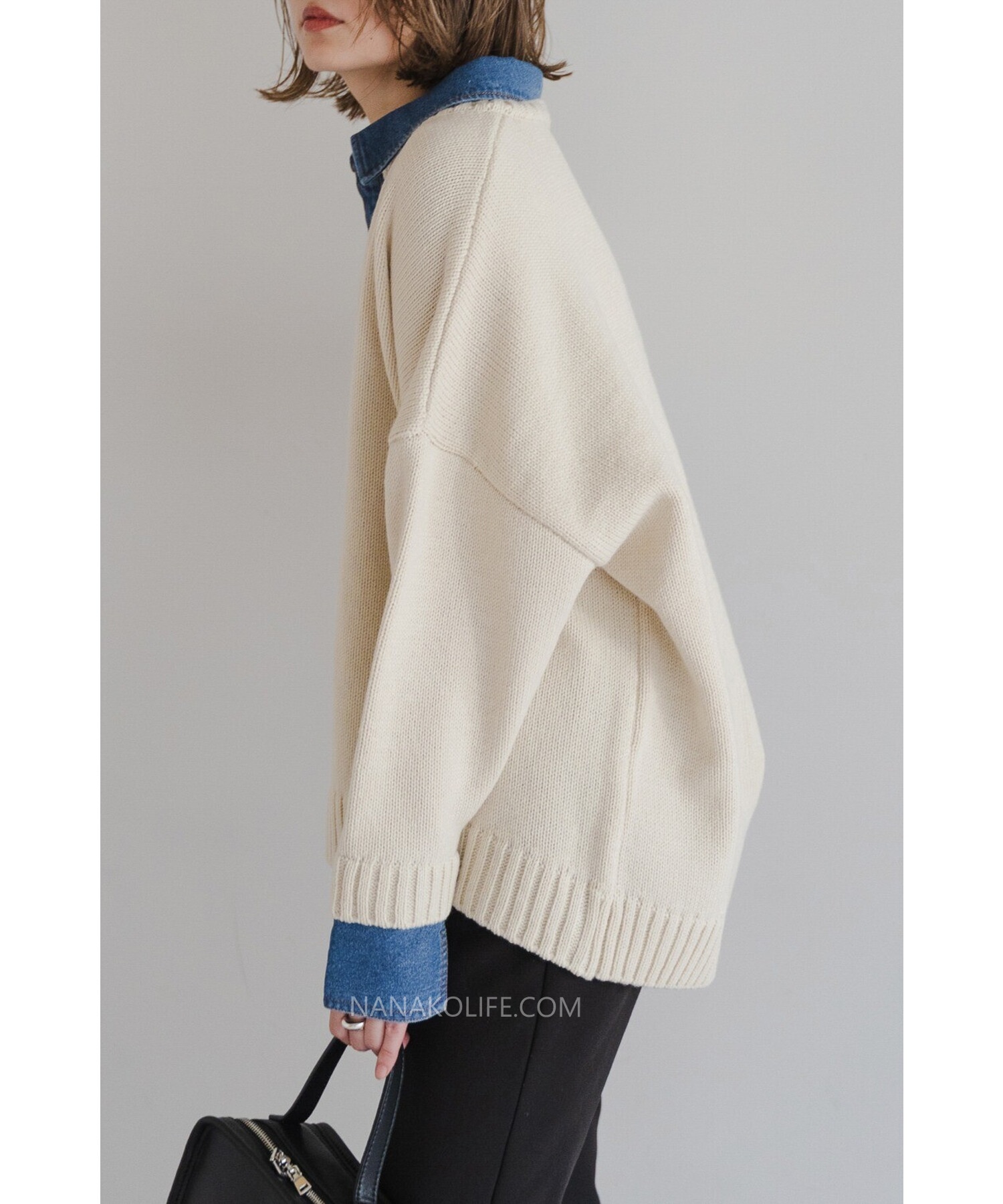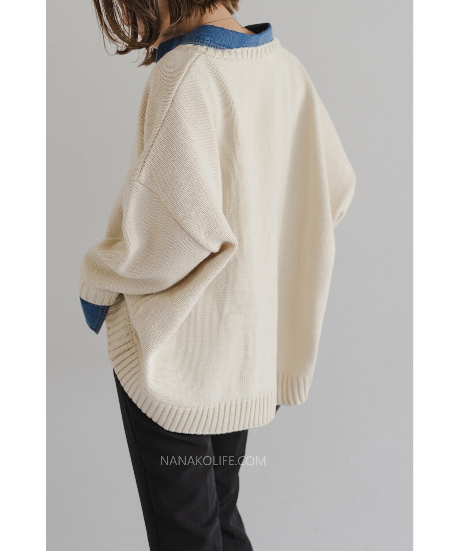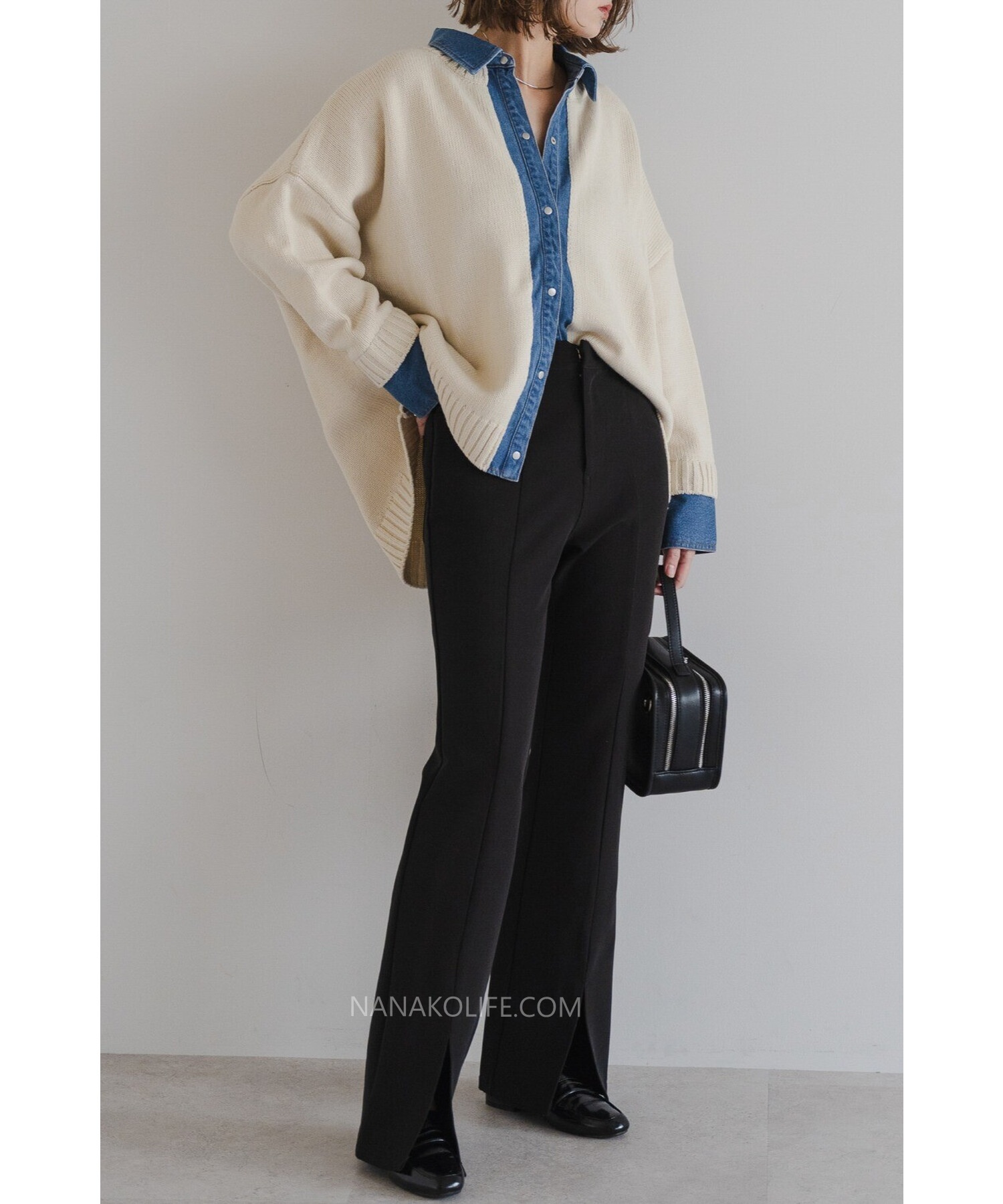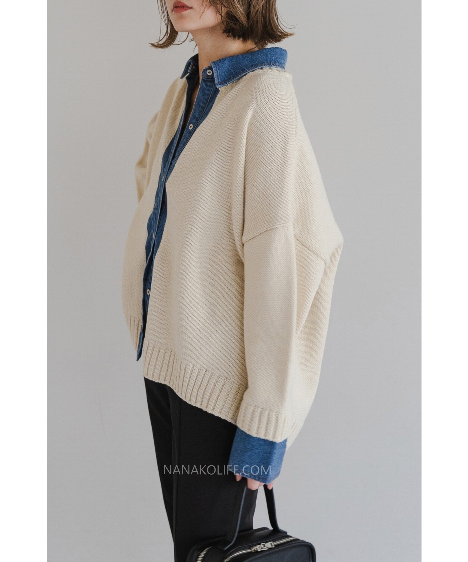 柔軟的米杏針織外層,把丹寧襯衫做成「假兩件」設計,